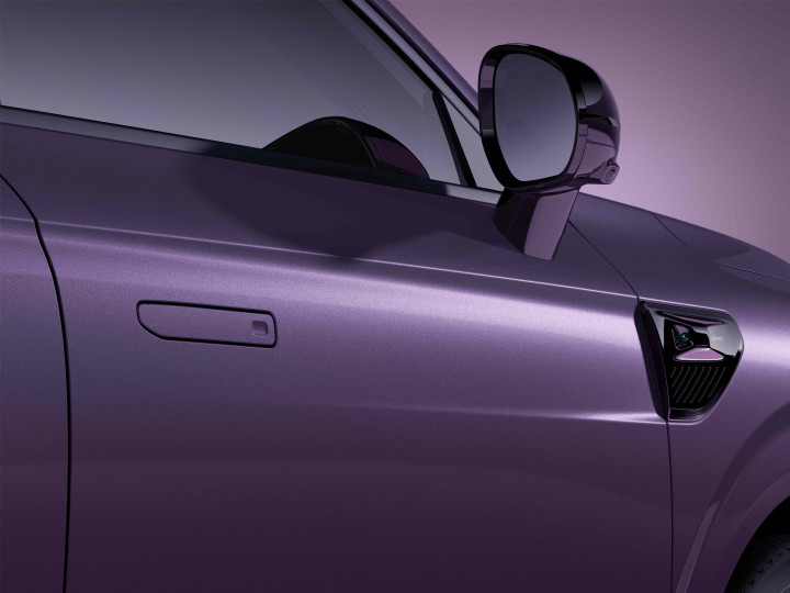 车身侧面,线条简洁流畅,动感十足。B/C 柱采用黑色涂装,与车窗外边缘的黑色饰条装饰相得益彰,营造出一种悬浮式车顶的效果。同时,前翼子板侧后向摄像头的设计既实用又美观,为车辆的安全性能提供了保障。